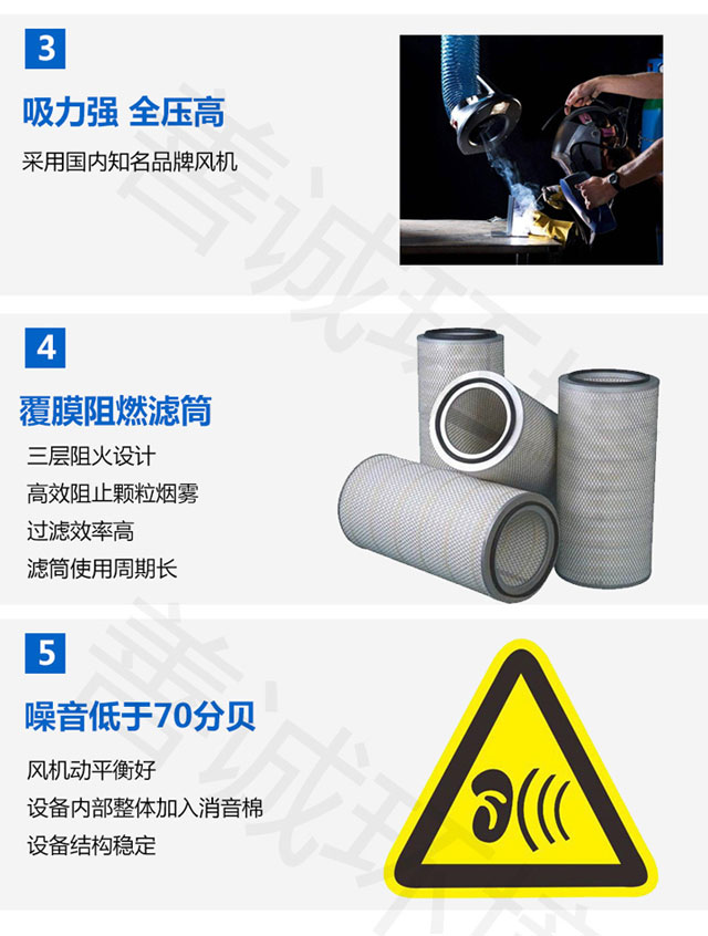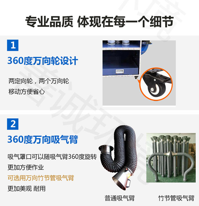 (4)移动性。采用万向轮并配备卡锁功能,方便任意移动确保电焊烟尘的点对点净化;